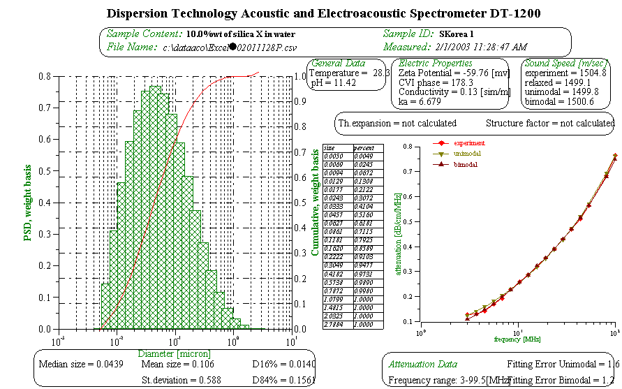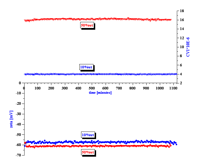 It turns out that this assumption is not valid, at least for these particular silica slurries. DT-1200 gives an opportunity to take into account surface conductivity by additional conductivity measurement and appropriate software.