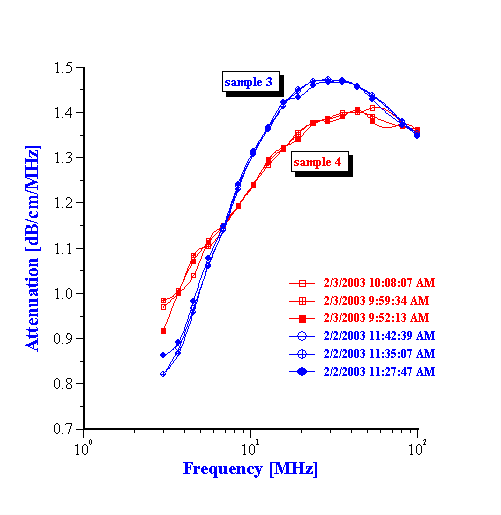 It turned out that attenuation at low frequency decays with time, reaching stable level roughly after 30 hours. Attenuation at high frequency remains practically unchanged, at 100MHz it is 0.457 dB/cm/MHz with standard variation of only 0.006 dB/cm/MHz .
