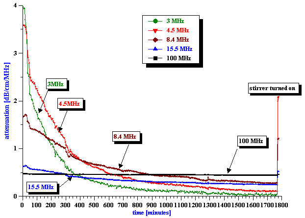 Starting measurements of attenuation under stirring conditions reveal very unusual attenuation curve. It is shown on Figure A.1, the highest attenuation reaching 4 dB/cm/MHz at low frequency. Normally we attribute this high attenuation at low frequency to bubbles. However, bubbles attenuation is not that much reproducible as we observe here.