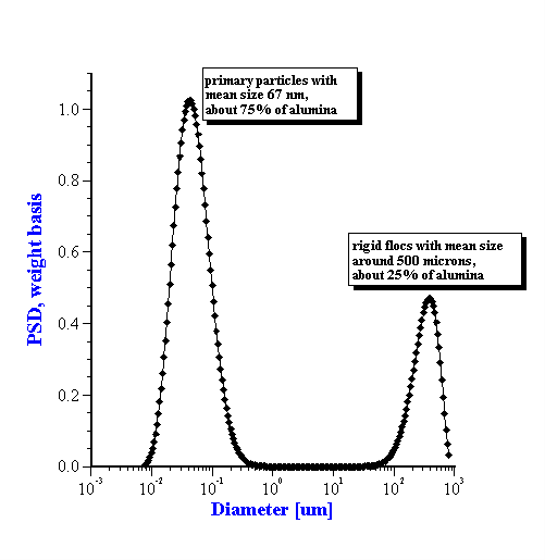 Aumina slurry contained two different fractions: 75% of small stable particles and 25% of very large rigid aggregate with high water content and yet no independent primary particles motion.